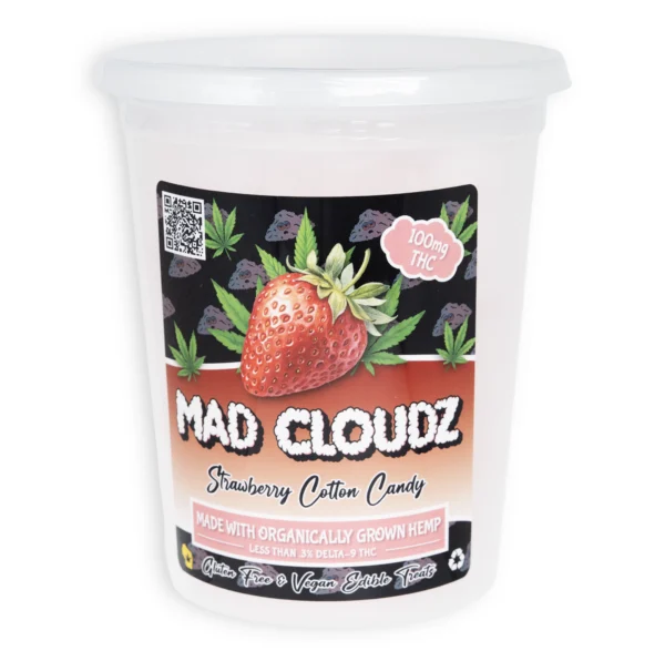Mad Cloudz Cotton Candy packs 100mg of Delta-9 THC into a fun, fluffy treat. Each serving delivers sweet flavor and uplifting effects in a light, melt-in-your-mouth form. Flavors include Watermelon, Blueberry, Plum, and Strawberry. A flavorful twist on edibles that turns any day into a festival.
